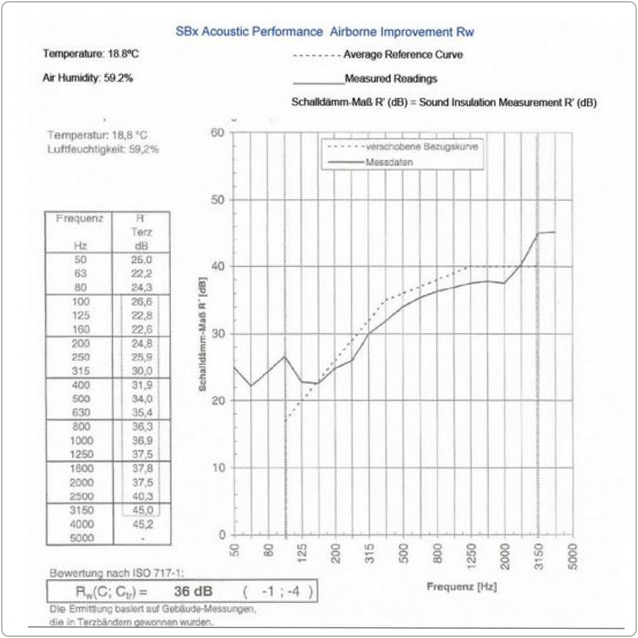 The airborne sound insulation as a single value is Rw = 36 dB. To give a guide to this the human ear would discern a 10 db fall as a halving of the sound it hears. 20dB would in theory cut the original sound by 75% ad 30 db by 82.5%.